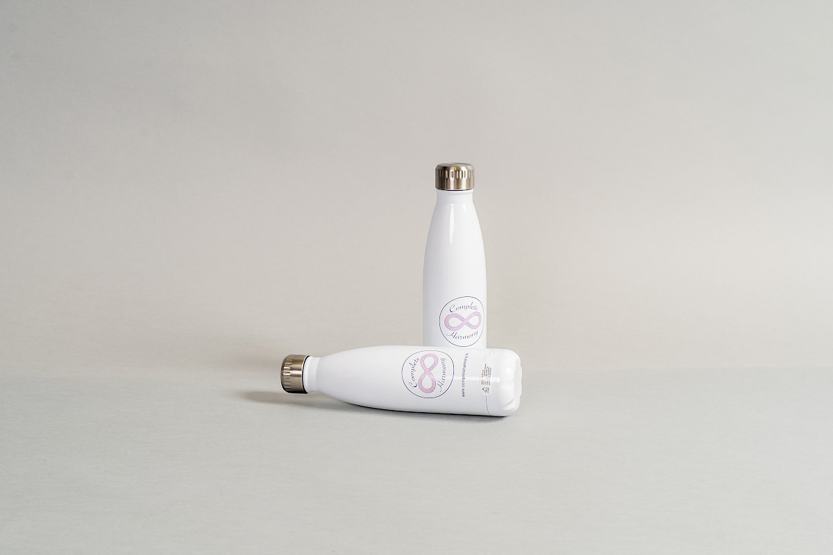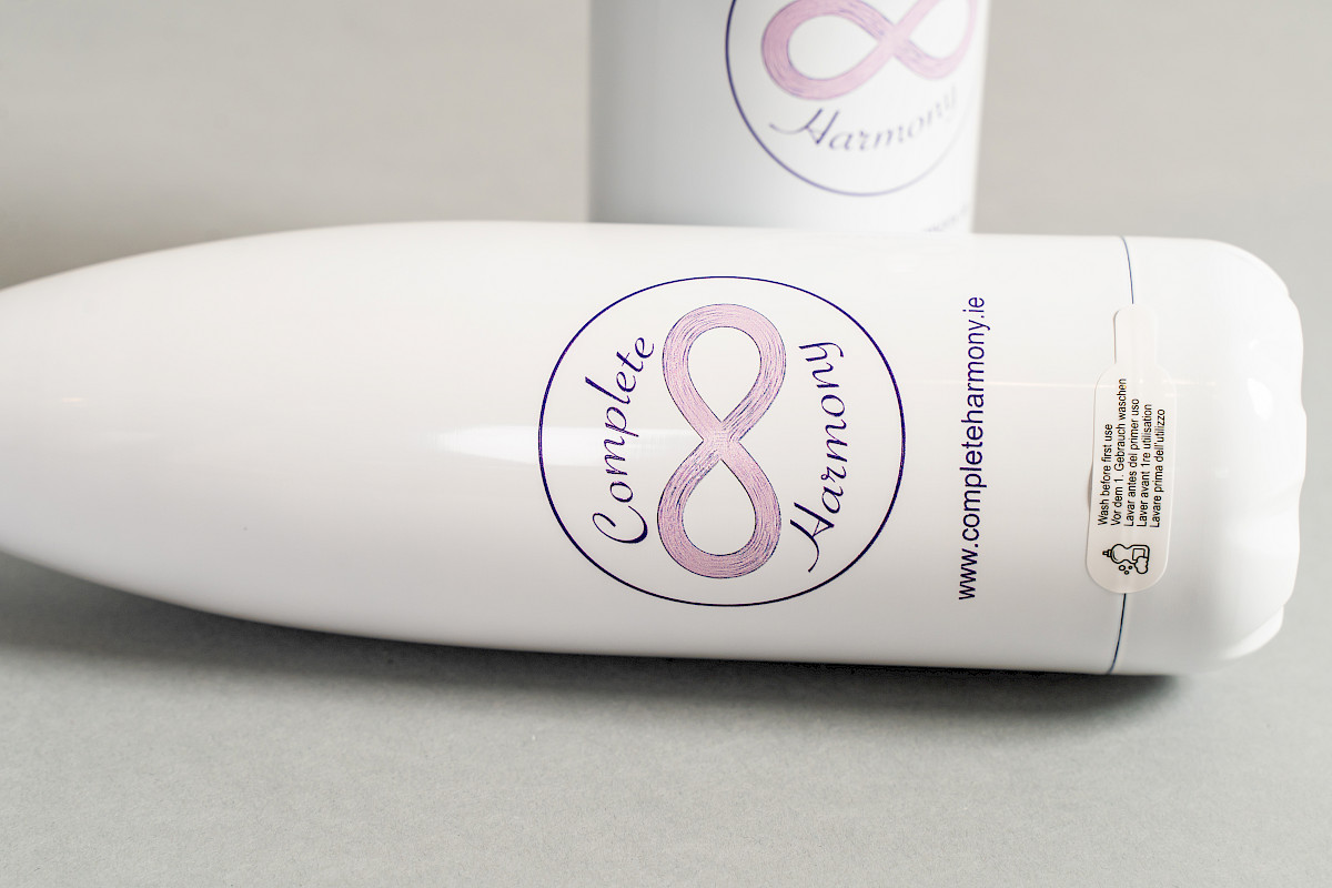 A Stainless Steel Water Bottle with Complete Harmony Branding